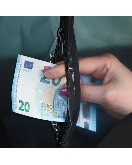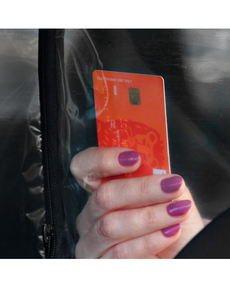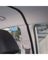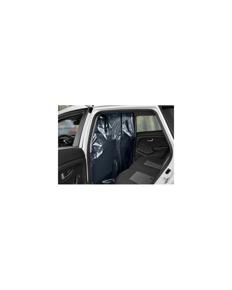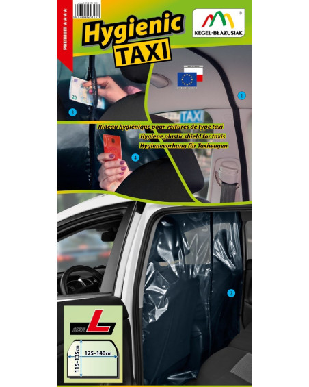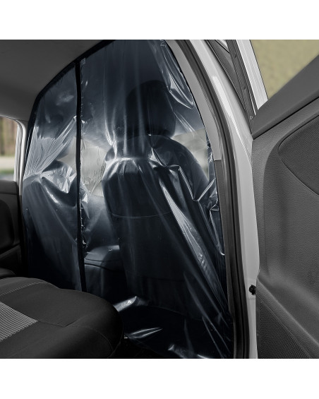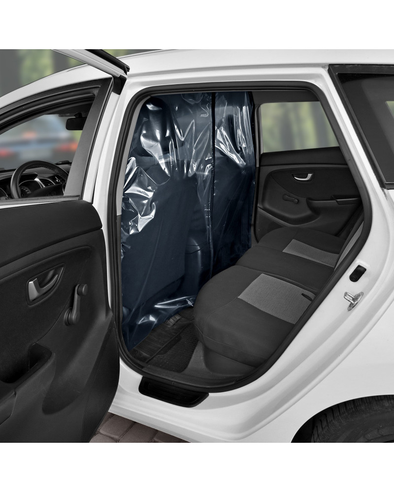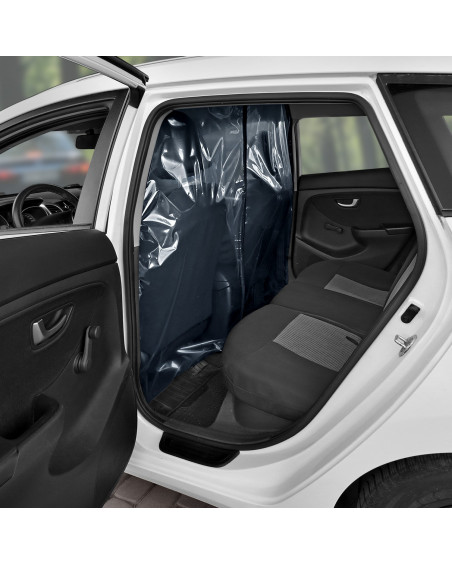 A transparent curtain separating the driver's area (two front seats) from the passenger area (rear seat). With an opening and adjustable slot on the driver's side for accepting payments. Contactless card payments can be accepted through the curtain without having to open it. When installed correctly, the curtain creates a highly airtight partition in the car. The curtain can be disinfected with commonly available disinfectants and cleaned with commonly available cleaning agents. Simple installation without tools using industrial self-adhesive Velcro tape and strong self-adhesive Velcro tape.
