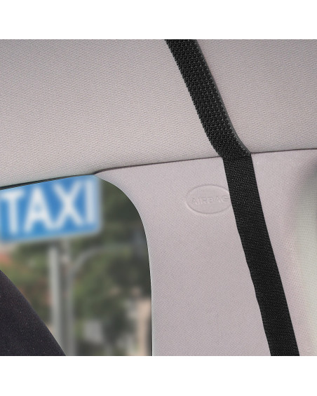 Place the curtain in the car behind the front seats so that the upper part marked with the Kegel-Błażusiak label is at the top. Then, starting from the top, attach the curtain by pressing the Velcro tape of the curtain onto the Velcro tapes stuck to the ceiling and pillars of the car. If the curtain is too large, make folds at the car pillars by gathering the Velcro tape of the curtain. Unzip the bottom of the curtain to create a suitable opening for the centre tunnel in the car floor. Attach the hooks included in the package to the fastening loops. Then slide the lower parts of the curtain under the seats and attach them to the underside of the seat structure using the hooks. By opening the zip on the opposite side, a gap is created through which the driver can accept payment from passengers sitting on the rear seat.