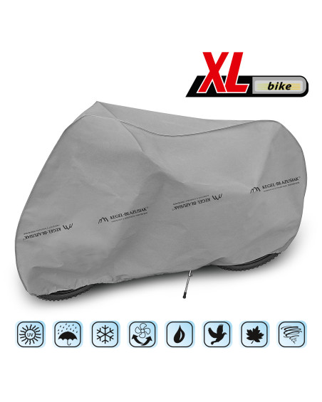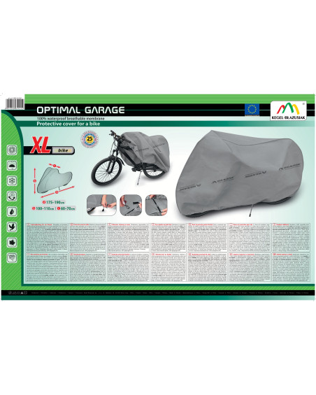 Membrane, waterproof and at the same time vapour permeable cover to protect your bike stored outdoors from adverse environmental influences. Weatherproof cover made entirely from a highly vapour-permeable membrane. Impermeable even in heavy rain and at the same time vapour permeable, it transports moisture away from under the cover. Reduces corrosion and ageing of plastic parts, protects against fading and tarnishing of paintwork and chrome parts. The cover is attached with an elastic puller which makes it easy to be put on and taken off the bike. Extra fasteners placed underneath prevent the cover from being ripped off by the wind. It is suitable for long or short-term storing of a bike without an electric drive. It can also be used indoors.