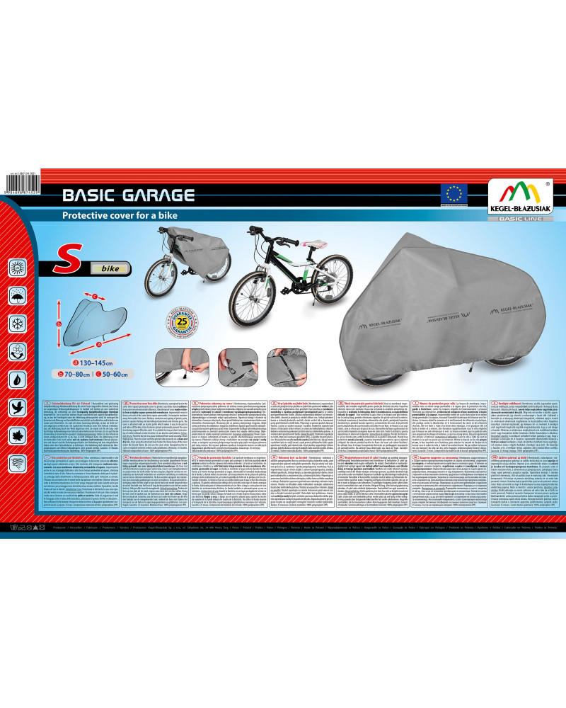 Park the bicycle in a place sheltered from wind securing it from tipping over. Place the cover with the printed side outwards on a clean and dry bike, then using the attached hook fasten the fixing loops of the cover under the bicycle frame. Do not use the cover when transporting the bicycle on exposed external vehicle racks (platforms).