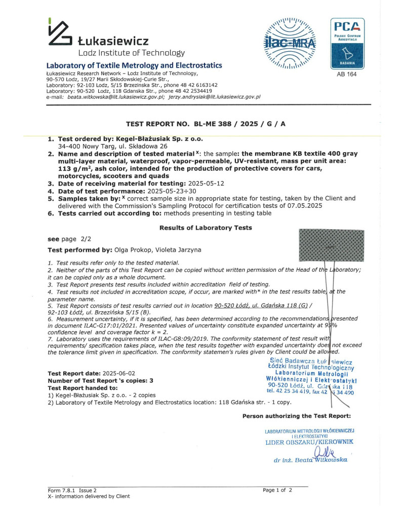 Below is a report on the vapour permeability of the membrane used to manufacture Optimal Garage covers. The test was carried out in an independent research laboratory.