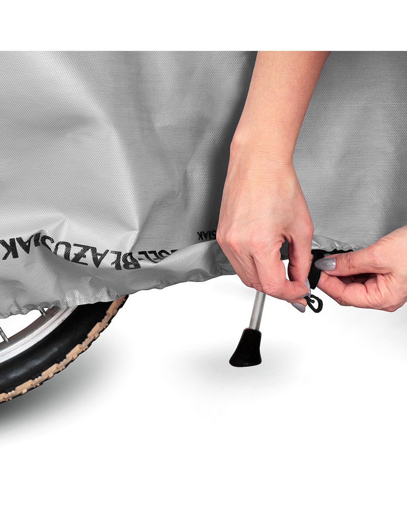 Park the bicycle in a place sheltered from wind securing it from tipping over. Place the cover with the printed side outwards on a clean and dry bike, then using the attached hook fasten the fixing loops of the cover under the bicycle frame. Do not use the cover when transporting the bicycle on exposed external vehicle racks (platforms).
