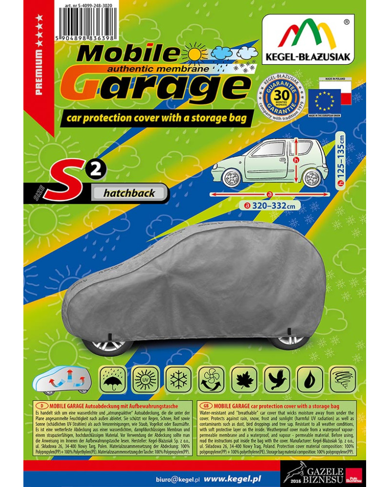 The high-quality Mobile Garage cover is a product tailored to the needs of drivers. The cover is made of a 4-layer material that is thick, strong, and durable. The cover protects the entire car from harmful environmental influences. The Mobile Garage cover provides adequate protection for your vehicle throughout the year. Its functionality can be appreciated in every season. In winter, it prevents snow, frost, and ice from settling on the car and is resistant to freezing; in autumn, it protects against rain, wind, leaves, and tree sap; and in summer and spring, it protects against UV rays, dust, and bird droppings.