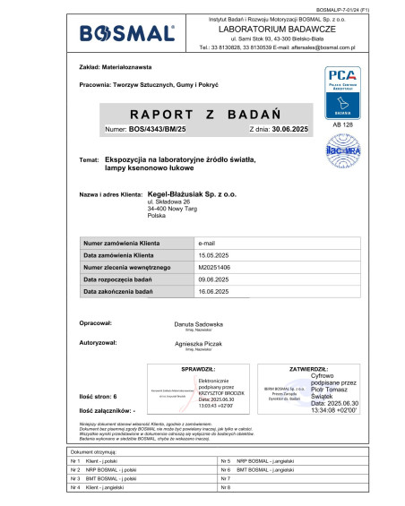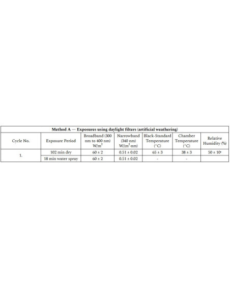 Representative samples of the material used to manufacture Mobile Garage covers were tested at the BOSMAL Automotive Research and Development Institute. The testing was carried out in accordance with the PN-ISO 4892-2:2013-6 standard, method A, cycle no. 1, consisting of a dry phase during which the samples are exposed to a xenon lamp emitting the full spectrum of sunlight with increased intensity, and a phase of rain exposure. Below is an excerpt from the standard:
