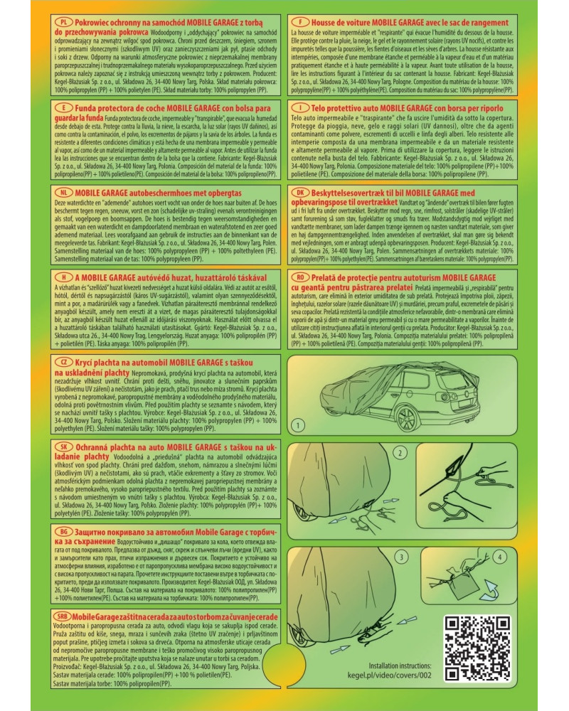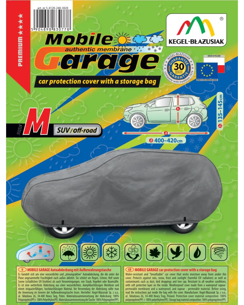 The high-quality Mobile Garage cover is a product tailored to the needs of drivers. The cover is made of a 4-layer material that is thick, strong, and durable. The cover protects the entire car from harmful environmental influences. The Mobile Garage cover provides adequate protection for your vehicle throughout the year. Its functionality can be appreciated in every season. In winter, it prevents snow, frost, and ice from settling on the car and is resistant to freezing; in autumn, it protects against rain, wind, leaves, and tree sap; and in summer and spring, it protects against UV rays, dust, and bird droppings.