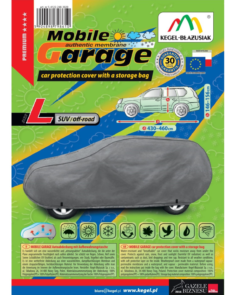 The high-quality Mobile Garage cover is a product tailored to the needs of drivers. The cover is made of a 4-layer material that is thick, strong, and durable. The cover protects the entire car from harmful environmental influences. The Mobile Garage cover provides adequate protection for your vehicle throughout the year. Its functionality can be appreciated in every season. In winter, it prevents snow, frost, and ice from settling on the car and is resistant to freezing; in autumn, it protects against rain, wind, leaves, and tree sap; and in summer and spring, it protects against UV rays, dust, and bird droppings.