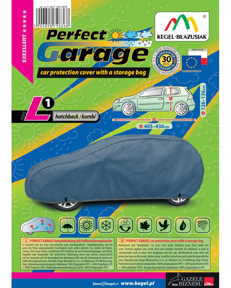 High-quality PERFECT GARAGE cover – waterproof and vapour-permeable. Manufactured in Poland, mainly from Polish raw materials, in compliance with all European Union quality standards. Years of experience and an increasingly sophisticated product range mean that KEGEL-BŁAŻUSIAK covers can be described as the best in Poland. A product from the PERFECT GARAGE series, whose motto is "very good quality".