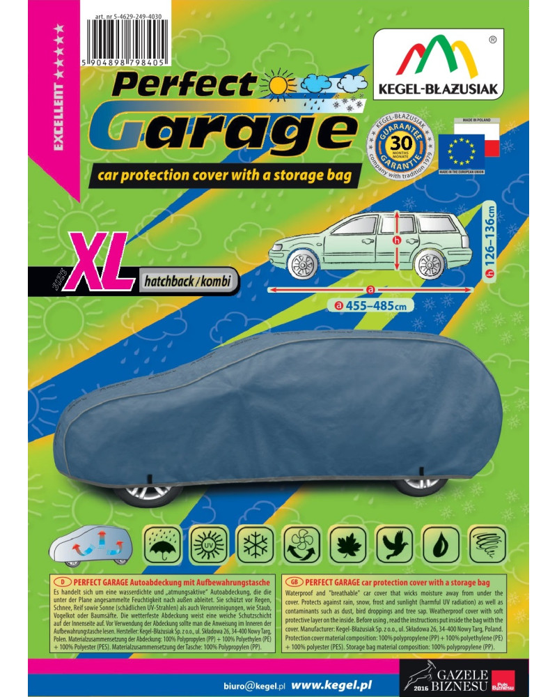 High-quality PERFECT GARAGE cover – waterproof and vapour-permeable. Manufactured in Poland, mainly from Polish raw materials, in compliance with all European Union quality standards. Years of experience and an increasingly sophisticated product range mean that KEGEL-BŁAŻUSIAK covers can be described as the best in Poland. A product from the PERFECT GARAGE series, whose motto is "very good quality".