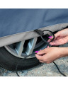 - Thread additional drawstrings through the loops sewn into the lower edge of the cover next to the car wheels and attach the cover to the car rims (do not attach to hubcaps).