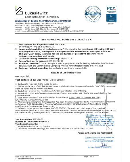Good tarpaulin covers should not only protect the car from precipitation, pollution and sunlight but should also be safe.  These are our Kegel-Błażusiak covers-tarpaulins. Our specialists carry out long-term tests of our covers-tarpaulins. We carry out tests for the effectiveness of protection of the vehicle by the cover-tarpaulin against weather conditions and water resistance, steam evacuation from under the cover, the safety of the cover for the vehicle paint coating and the effectiveness of fastening the cover on the vehicle in normal and extreme weather conditions. Our company Kegel-Błażusiak produces only those products that pass long-term tests.-