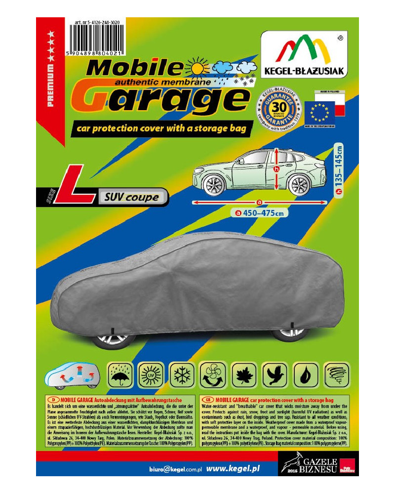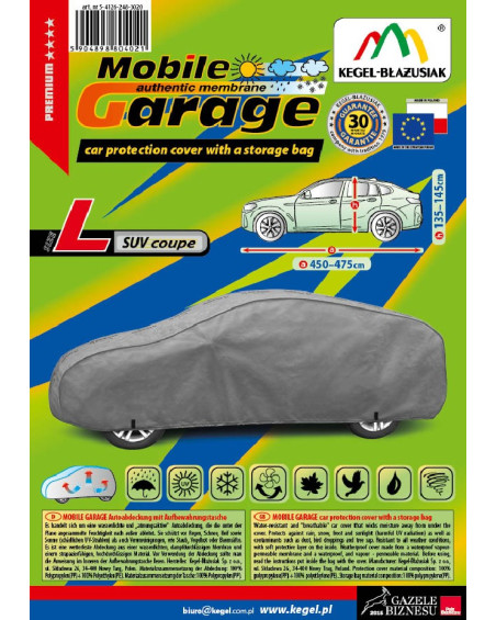 The high-quality Mobile Garage cover is a product tailored to the needs of drivers. The cover is made of a 4-layer material that is thick, strong, and durable. The cover protects the entire car from harmful environmental influences. The Mobile Garage cover provides adequate protection for your vehicle throughout the year. Its functionality can be appreciated in every season. In winter, it prevents snow, frost, and ice from settling on the car and is resistant to freezing; in autumn, it protects against rain, wind, leaves, and tree sap; and in summer and spring, it protects against UV rays, dust, and bird droppings.