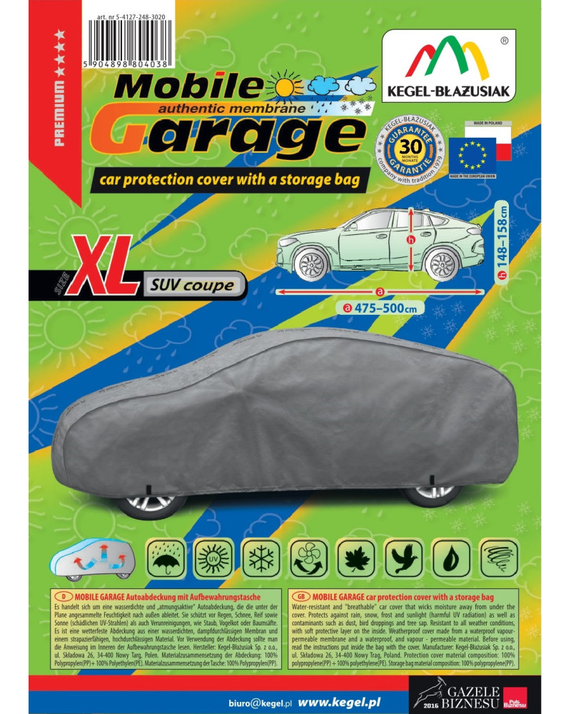 The high-quality Mobile Garage cover is a product tailored to the needs of drivers. The cover is made of a 4-layer material that is thick, strong, and durable. The cover protects the entire car from harmful environmental influences. The Mobile Garage cover provides adequate protection for your vehicle throughout the year. Its functionality can be appreciated in every season. In winter, it prevents snow, frost, and ice from settling on the car and is resistant to freezing; in autumn, it protects against rain, wind, leaves, and tree sap; and in summer and spring, it protects against UV rays, dust, and bird droppings.