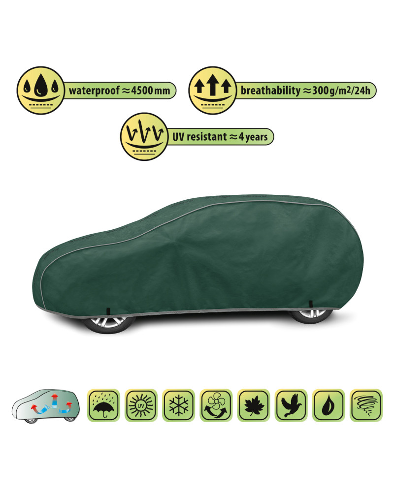The unique properties of the multi-layer material ensure that the cover is waterproof, while allowing water vapour to escape from under the cover. Any moisture that accumulates under the cover will quickly evaporate, preventing rust and mould from forming on the car. The cover is suitable for both temporary and long-term use.