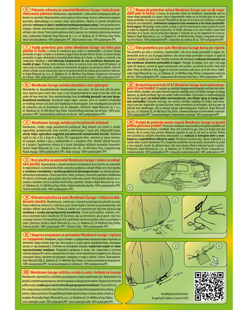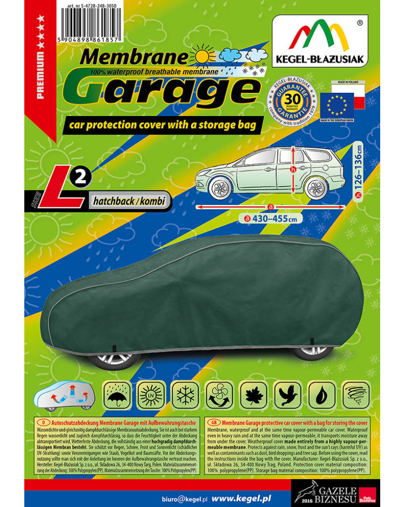 The high-quality Membrane Garage cover is a product tailored to the needs of drivers. The cover is made entirely of 4-layer material, which is thick, strong and durable. The cover protects the entire car from harmful environmental influences. The Membrane Garage cover provides adequate protection for your vehicle throughout the year. Its functionality can be appreciated in every season. In winter, it prevents snow, frost and ice from settling and is resistant to freezing; in autumn, it protects against rain, wind, leaves and tree sap; and in summer and spring, it protects against UV rays, dust and bird droppings.