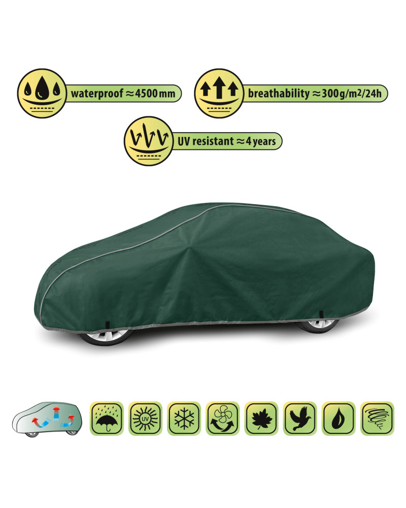 The unique properties of the multi-layer material ensure that the cover is waterproof, while allowing water vapour to escape from under the cover. Any moisture that accumulates under the cover will quickly evaporate, preventing rust and mould from forming on the car. The cover is suitable for both temporary and long-term use.