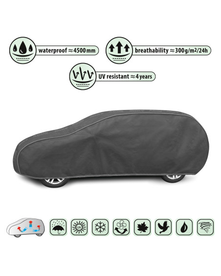 A membrane, waterproof and vapour-permeable car cover. Waterproof even during heavy rain and vapour-permeable, wicking moisture away from under the cover. Weather-resistant cover made entirely of a highly vapour-permeable membrane. It protects against rain, snow, frost and sunlight (harmful UV rays) as well as contaminants such as dust, bird droppings and tree sap.