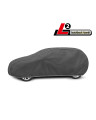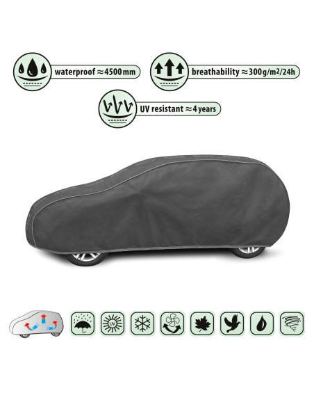 The unique properties of the multi-layer material ensure that the cover does not get wet, while allowing water vapour to escape from under the cover. Any moisture that accumulates under the cover will quickly evaporate, preventing rust and mould from forming on the car. The cover is suitable for both temporary and long-term use. The cover can be hand washed at 40 degrees. The cover is grey in colour, which is extremely practical and looks great. The centre of the cover features the manufacturer's name and logo, as well as the name of the material from which it is made, guaranteeing the originality and high quality of the product. The variety of shapes and sizes means that you can choose a cover that fits your car perfectly.