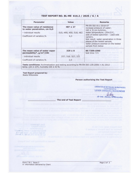 A vapour permeability rating of 329 means that 329 g of water vapour passed through one square metre of KB Textil 400 grey membrane in 24 hours at a temperature of approx. 20 degrees Celsius. Waterproofness with a score of 487 means that the KB Textil 400 grey membrane only became wet at a water column height of 487 cm (i.e. 4870 mm), which means that the membrane is completely waterproof even during heavy and prolonged rain.