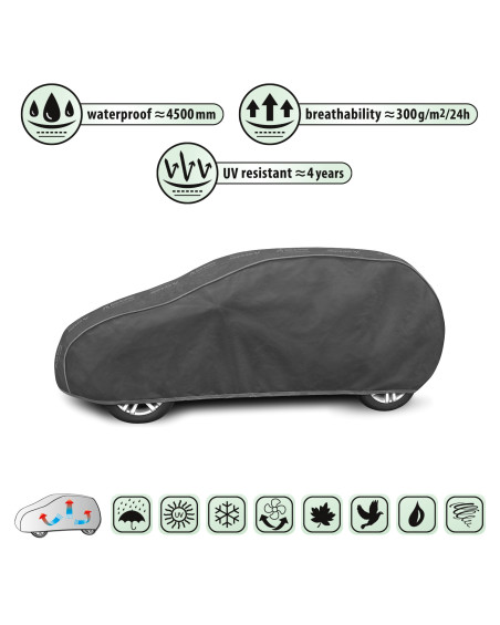 A membrane, waterproof and vapour-permeable car cover. Waterproof even during heavy rain and vapour-permeable, wicking moisture away from under the cover. Weather-resistant cover made entirely of a highly vapour-permeable membrane. It protects against rain, snow, frost and sunlight (harmful UV rays) as well as contaminants such as dust, bird droppings and tree sap.