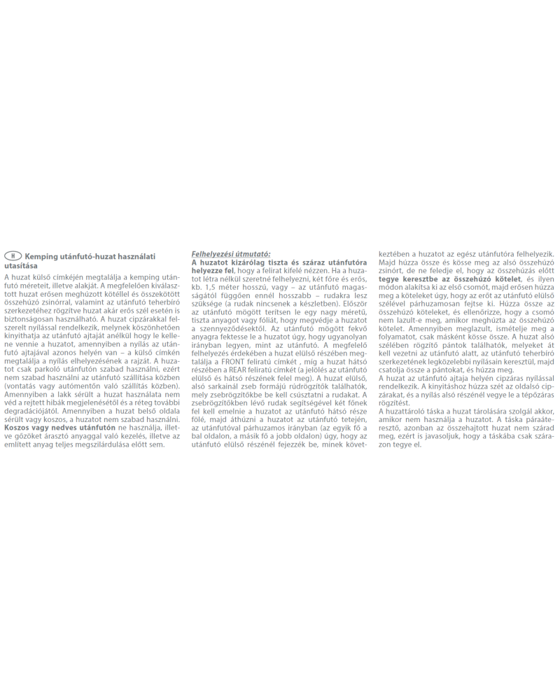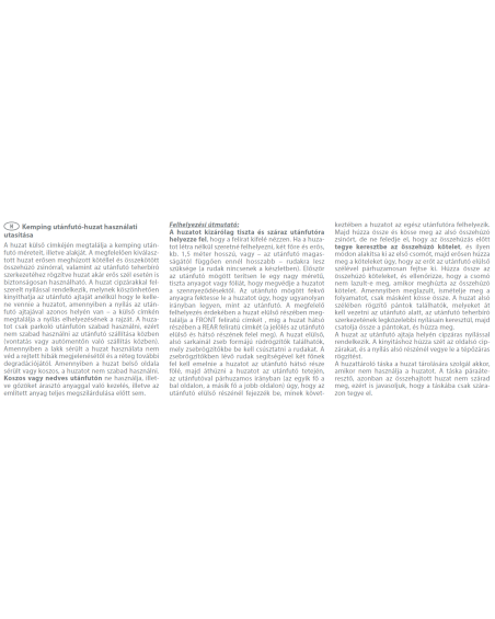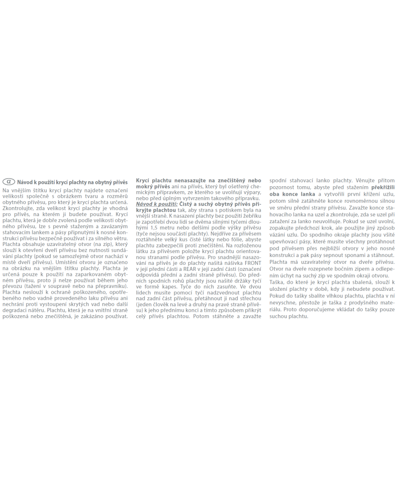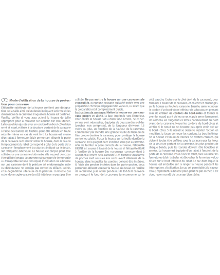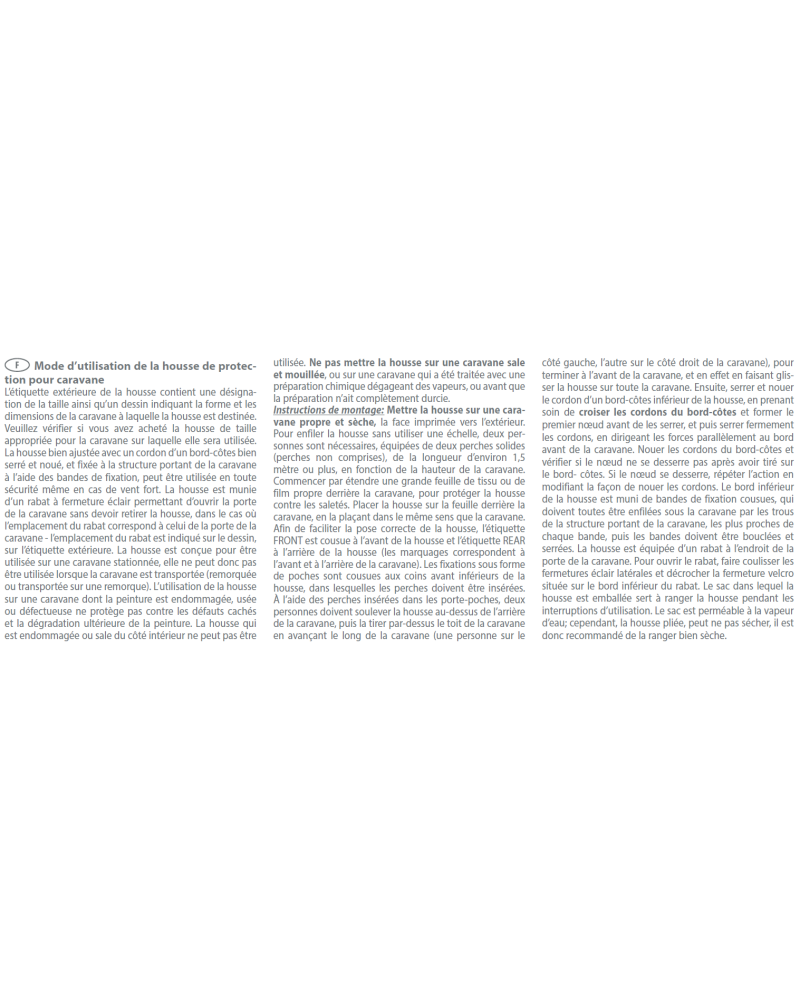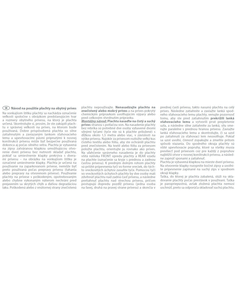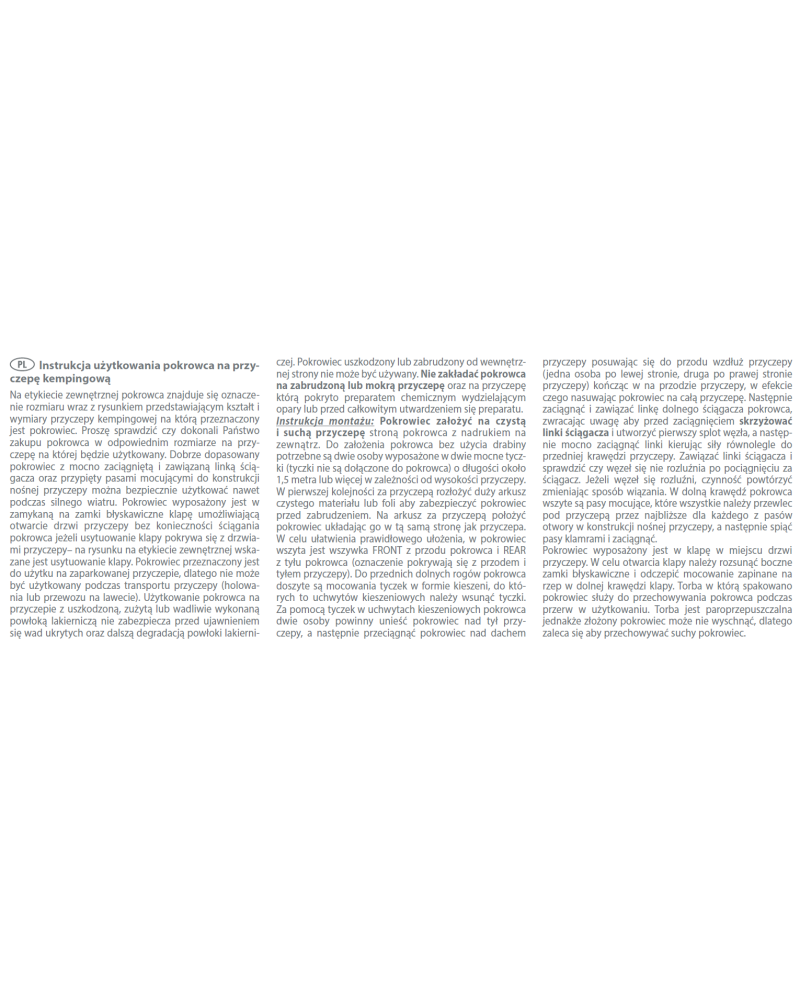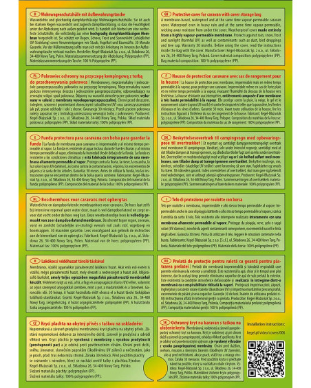 Put the cover on a clean and dry caravan with the printed side facing outwards. To fit the cover without the use of a ladder, you will need two people with two strong poles (poles not included with the cover) about 1.5 metres or more in length depending on the height of the caravan. First lay out a large sheet of clean cloth or foil behind the caravan to protect the cover from dirt. Place the cover on the sheet behind the caravan, laying it in the same direction as the caravan. To facilitate correct positioning, a label marked „FRONT” has been sewn on the front of the cover and the one marked „BACK” on the back of the cover (the markings correspond with the front and back sides of the caravan). Pole holders have been sewn into the lower front corners of the cover in the form of pockets into which the poles must be inserted. Using the poles inserted in the pocket holders, two people should lift the cover over the back of the caravan and then pull the cover over the roof of the caravan moving forward along the whole length of the caravan (one person on the left side, the other on the right side of the caravan) ending up at the front of the caravan, in effect pulling the cover over the entire vehicle. Next, tighten and tie the lower cord of the cover, taking care to cross the cords to form the first knot, then tighten the cords firmly, directing the forces parallel to the front edge of the caravan. Tie the turnbuckle cords and check that the knot does not loosen when the turnbuckle is pulled. If the knot loosens, repeat the operation by changing the tying method. The lower edge of the cover has lashing straps sewn into it, all of which must be threaded under the caravan through the nearest holes in the caravan’s substructure for each strap, then the straps must be buckled and tightened.