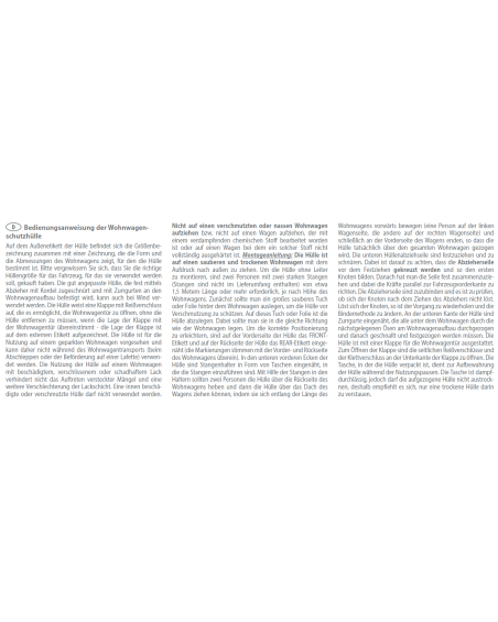The cover is fitted with a flap in place of the caravan door. To open the flap, the side zips must be pulled apart and the Velcro fastening at the lower edge of the flap must be detached.