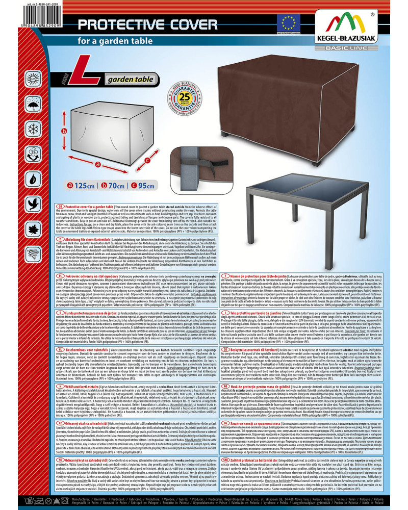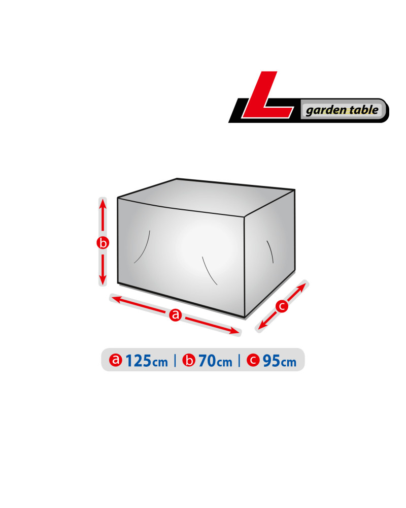 Year-round cover to protect a garden table stored outside from the adverse effects of the environment. Due to its special design, water runs off the cover when it rains without penetrating under the cover. Protects the table from rain, snow, frost and sunlight (harmful UV rays) as well as contaminants such as dust, bird droppings and tree sap. It reduces corrosion and ageing of plastic or wooden parts, protects against fading and tarnishing of lacquer and chrome parts. The cover is fully resistant to all weather conditions. Easy to put on and take off. Additional fastenings prevent the cover from being torn off by the wind. Also suitable for indoor use.