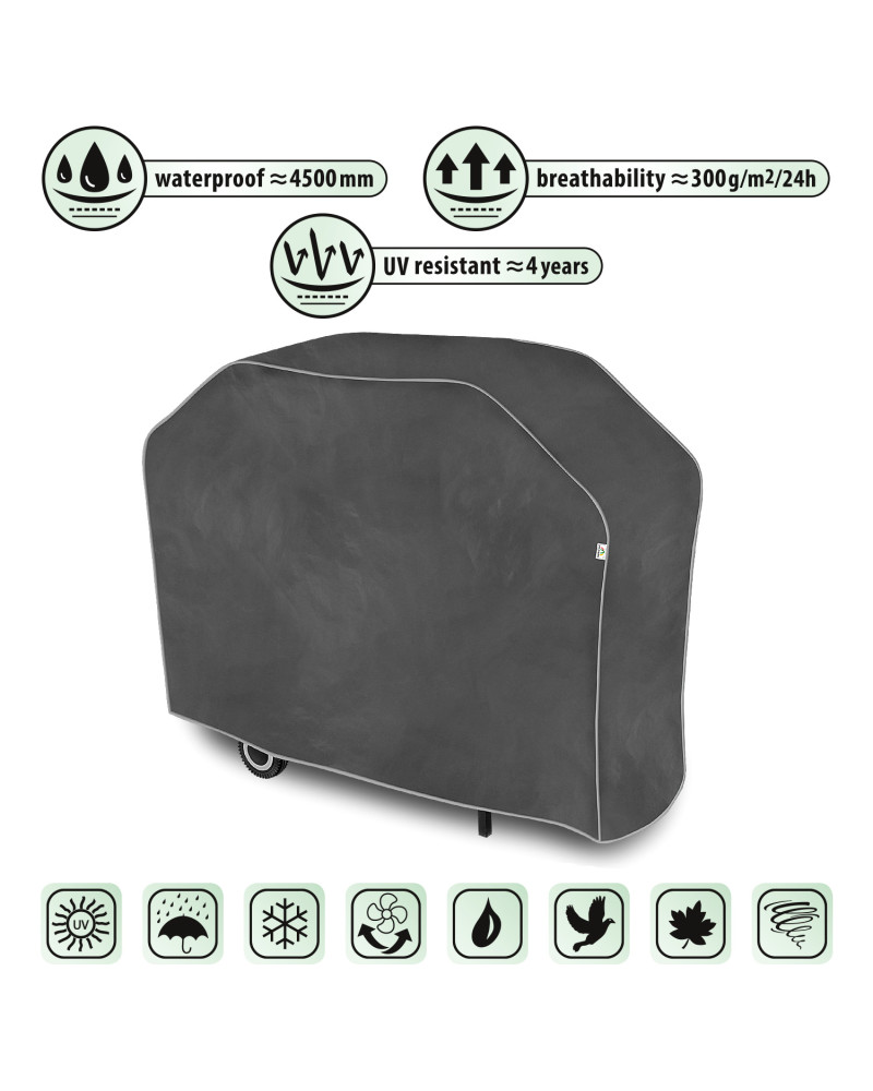 Protects your outdoor barbecue from rain, snow, frost and sun rays (harmful UV) as well as contaminants such as dust, bird droppings and tree sap. Easy to put on and take off. Additional fastenings prevent the cover from being ripped off by the wind. Also suitable for indoor use.