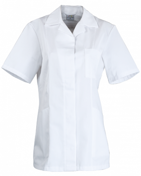The tunic features vertical shaping seams for a professional yet feminine silhouette, snap-button fastenings, a collar-finished neckline, a patch breast pocket, and two slanted lower pockets. With hemmed short sleeves and a neatly finished bottom, it ensures unrestricted movement and all-day comfort.