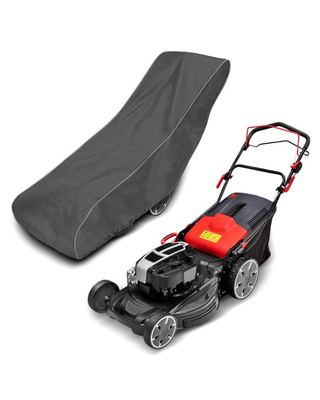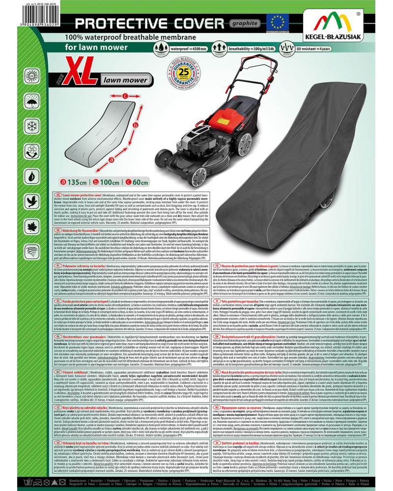 Membrane, waterproof and at the same time vapour-permeable cover to protect a petrol lawnmower stored outdoors from adverse environmental effects . Weatherproof cover made entirely of a highly vapour-permeable membrane. Impermeable even in heavy rain and at the same time vapour-permeable, wicking away moisture from under the cover. It protects the mower from rain, snow, frost and sunlight (harmful UV rays) as well as contaminants such as dust, bird droppings and tree sap. It reduces corrosion and ageing of plastic parts, protects against fading and tarnishing of paintwork and chrome parts.