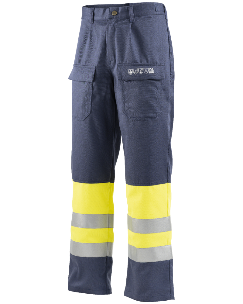 Hi-vis multi-norm, reflective trousers from the Protective collection ensure safety and protect the user against multiple hazards occurring simultaneously in the work environment: ignition as a result of brief contact with flames and exposure to hot factors, spark discharges that could ignite an explosive mixture, electrostatic discharges, convective heat transfer, thermal radiation, molten iron splashes, contact heat and the effects of liquid chemicals in the event of splashing.