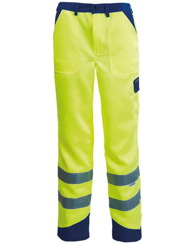 Kneiter 5920 high-visibility trousers (yellow and navy blue) ensure safety and protection in all conditions and workplaces where employees must be clearly visible to drivers and other mechanical equipment operators, both in daylight and at night (headlights).
