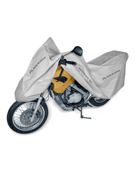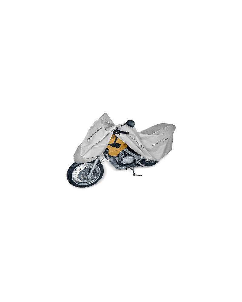 A membrane-based, waterproof and at the same time vapour-permeable cover to protect your combustion or electric motorcycle from adverse environmental influences. Weatherproof cover made entirely of a highly vapour-permeable membrane. Waterproof even in heavy rain and at the same time vapour-permeable, wicking away moisture from under the cover. Protects against rain, snow, frost and sunlight (harmful UV) as well as contaminants such as dust, bird droppings and tree sap. Reduces corrosion and ageing of plastic parts, protects against fading and tarnishing of paintwork and chrome parts. Suitable for long or short-term outdoor storage of a combustion motorcycle or short-term storage of an electric motorcycle. Also suitable for indoor use. A drawstring and additional fasteners underneath the motorcycle protect the cover from being ripped off by wind. Holes in the cover allow the motorcycle to be attached by the front wheel with the cover using a lock or chain.