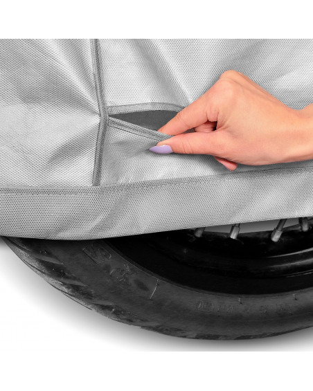 A membrane-based, waterproof and at the same time vapour-permeable cover to protect your combustion or electric motorcycle from adverse environmental influences. Weatherproof cover made entirely of a highly vapour-permeable membrane. Waterproof even in heavy rain and at the same time vapour-permeable, wicking away moisture from under the cover. Protects against rain, snow, frost and sunlight (harmful UV) as well as contaminants such as dust, bird droppings and tree sap. Reduces corrosion and ageing of plastic parts, protects against fading and tarnishing of paintwork and chrome parts. Suitable for long or short-term outdoor storage of a combustion motorcycle or short-term storage of an electric motorcycle. Also suitable for indoor use. A drawstring and additional fasteners underneath the motorcycle protect the cover from being ripped off by wind. Holes in the cover allow the motorcycle to be attached by the front wheel with the cover using a lock or chain.