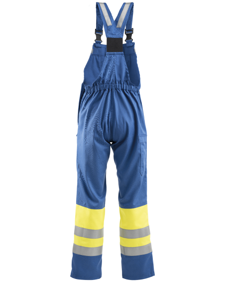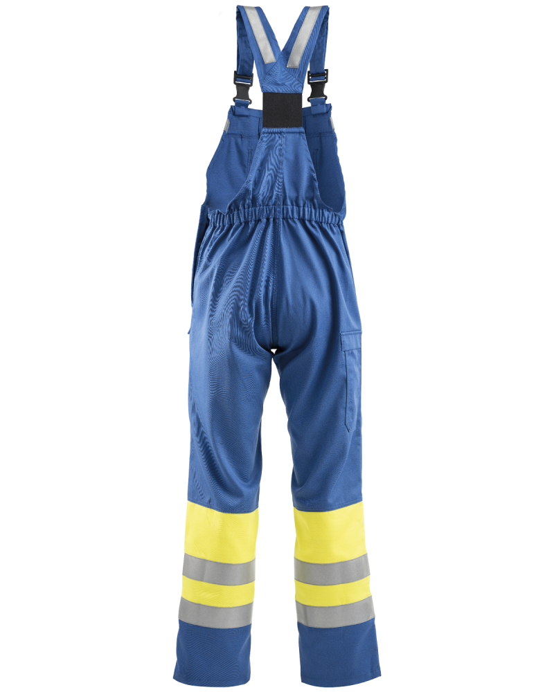 Hi-vis multi-norm bib and brace overalls ensure safety and protect the user against multiple hazards occurring simultaneously in the work environment: ignition as a result of brief contact with flames and exposure to hot factors, spark discharges that could ignite an explosive mixture, electrostatic discharges, convective heat transfer, thermal radiation, molten iron splashes, contact heat and the effects of liquid chemicals in the event of splashing.