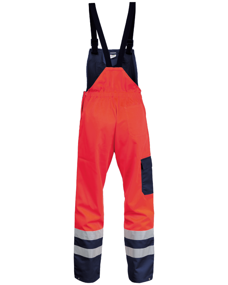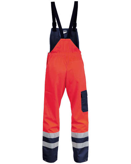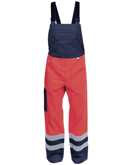 Navy and red hi-vis overalls ensure safety and protection in all conditions and workplaces where employees must be clearly visible to drivers and other mechanical equipment operators, both in daylight and at night (headlights). Additional protection is provided by 5 cm wide reflective strips. Clothing designed for road workers, logistics centres, warehouses, airports, transport companies and anywhere else where work requires high-visibility clothing in accordance with EN ISO 20471.