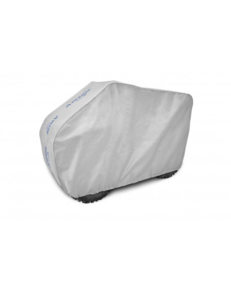 A membrane-based, waterproof and at the same time vapour-permeable cover to protect your combustion or electric quad from adverse environmental influences. Weatherproof cover made entirely of a highly vapour-permeable membrane. Waterproof even in heavy rain and at the same time vapour-permeable, wicking away moisture from under the cover. Protects against rain, snow, frost and sunlight (harmful UV) as well as contaminants such as dust, bird droppings and tree sap. Reduces corrosion and ageing of plastic parts, protects against fading and tarnishing of paintwork and chrome parts. Suitable for long or short-term outdoor storage of a combustion quad or short-term storage of an electric quad. Also suitable for indoor use. A drawstring and additional fasteners underneath the quad protect the cover from being ripped off by the wind. Holes in the cover allow the quad to be attached by the front wheel with the cover using a lock or chain.