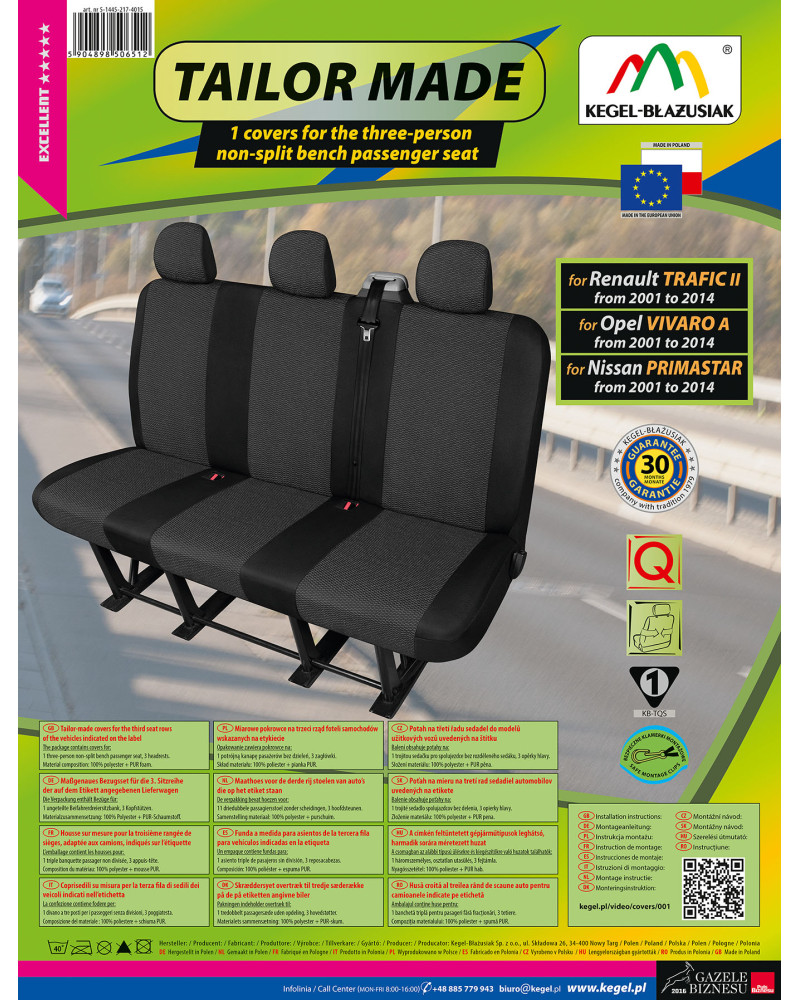 TAILOR MADE covers are made of high-quality upholstery fabric (both front and back), which, combined with careful attention to even the smallest details, will satisfy the most demanding customers. Thanks to their appropriate, spacious design and specific fit to your car, the covers fit the seats perfectly. The fabric adheres perfectly to the seats, replacing their original upholstery. Laminating the entire fabric on the inside with flame-retardant PUR foam prevents them from slipping.