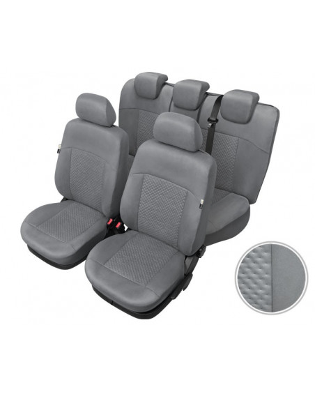 Arcadia well-fitted covers are very elegant and tasteful covers for passenger cars that make an impression. Made entirely of high-quality Alcantara suede fabric in grey, they have an extremely attractive, original look. In addition, they are very strong and durable, meeting the highest strength standards for upholstery materials. The material used for the side parts has been laminated with PUR foam, which allows the covers to fit securely on the seat. The material in the central part of the covers has been ultrasonically bonded to a fluffy non-woven fabric with an original, delicate pattern embossed on it. The Arcadia covers we offer are produced in a practical and elegant grey colour. The subdued, delicate colour scheme will fit perfectly into the interior of any car. The fine pattern in the middle, high-quality material and colour will give the interior class, elegance and style. Arcadia covers are characterised by high durability, abrasion resistance and ease of maintenance. In addition, they offer very good value for money, as despite being truly high-end, their price is very reasonable.