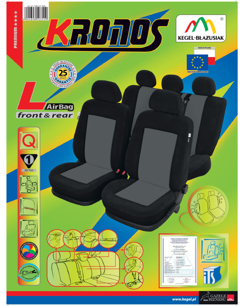 Universal fitted covers KRONOS – extremely durable and resistant covers, made of jacquard fabric manufactured in the USA, additionally laminated on the inside with PUR foam, ensuring good adhesion of the covers to the car seats. The covers were designed mainly for new car models, including those with side airbags. Thanks to the use of safe seams, putting the covers on the seats does not in any way prevent the side airbags from deploying. The covers fit well on a selected group of car models. They are equipped with special, certified seams for side airbags, which tear in the right place when they are deployed - the safety of the seam is confirmed by a certificate and tests carried out by the Motor Transport Institute. The covers have been carefully designed and thoroughly tested, which is why they fit the seats of specific cars. We manufacture KRONOS covers in the Dividable System version with the option of folding the split rear seat and extending the armrest. The 25-month warranty gives you the confidence that you are buying a top-quality product.