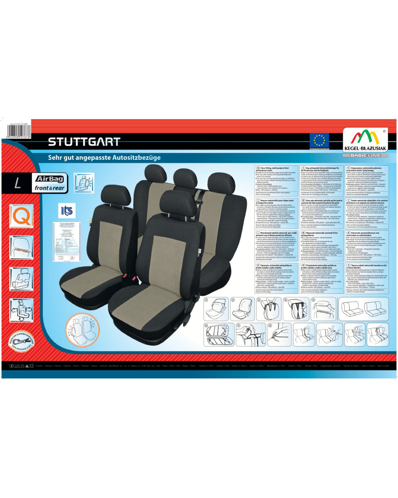 Universal fitted covers STUTTGART – well-fitted to selected car seats – safe and, on top of that, very attractive in appearance. They are equipped with special, certified seams for AirBag, which tear during the deployment of side airbags, and their safety has been confirmed by ITS tests. Made in a classic style from strong and durable upholstery fabric laminated with foam, thanks to which they adhere well to the upholstery, preventing the covers from sliding on the seats. The covers are completely enclosed at the back, which also protects the back of the seat. If you want to refresh the interior of your car or add style and elegance, if you want to protect your car's upholstery, you've come to the right place.