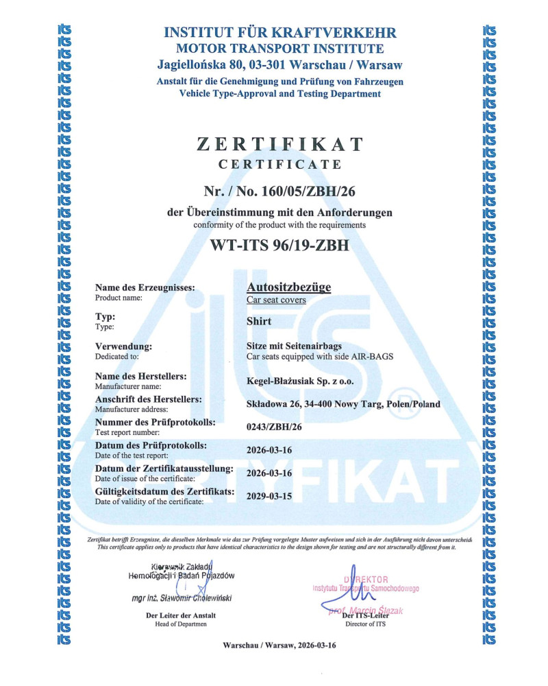 The safety of our covers is confirmed by a certificate and tests carried out by Instytut Transportu Samochodowego