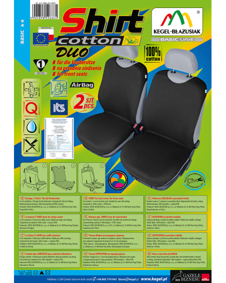 SHIRT COTTON DUO are made of high-quality natural material (100% cotton) , which, combined with the careful finishing of even the smallest details, will satisfy the most demanding customers. Thanks to their appropriate design and innovative construction, the covers fit well on the seats and adhere to them well, and the laminating of the entire material on the inside with PUR foam prevents them from sliding. SHIRT COTTON DUO covers are over 20% larger than their previous version, which makes them a much better fit for the seats of currently manufactured cars. This is because the seats of newer cars are larger than those of cars from 15 years ago. A new feature of the shirt covers is that they cover the entire usable part of the seat, thus better protecting the seat from damage and dirt. However, they do not cover the sides of the seat, so they can be safely used on seats with airbags. Shirt covers oprotect and, at the same time, noticeably change the appearance of car seats, giving the car a unique character.