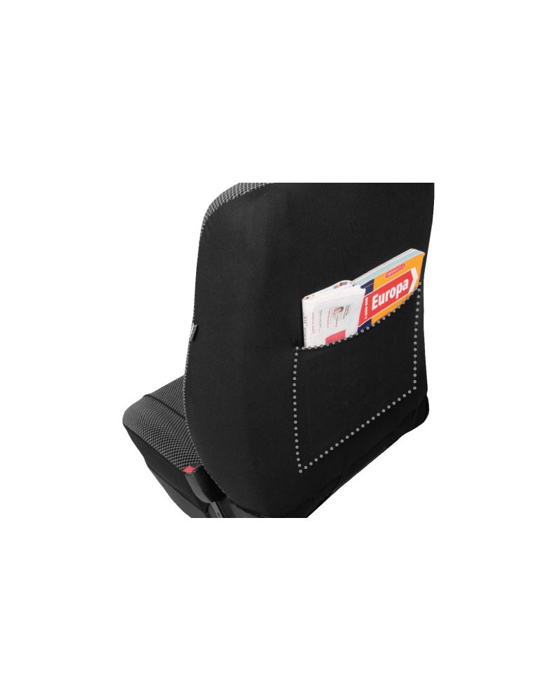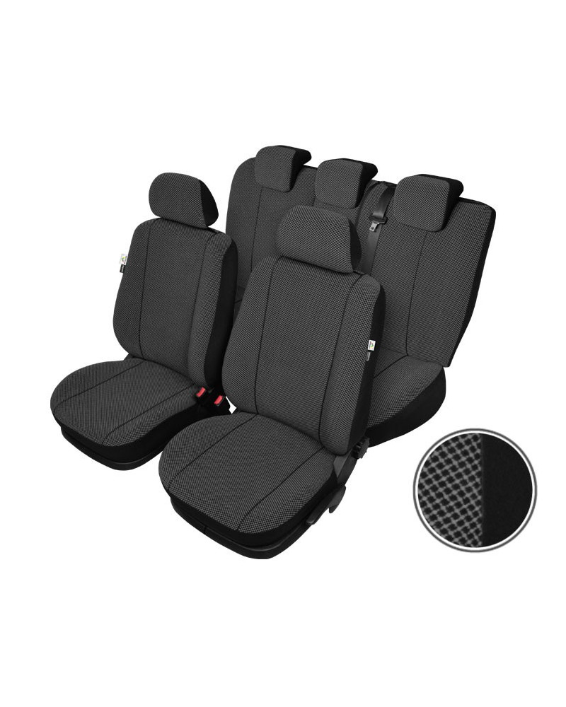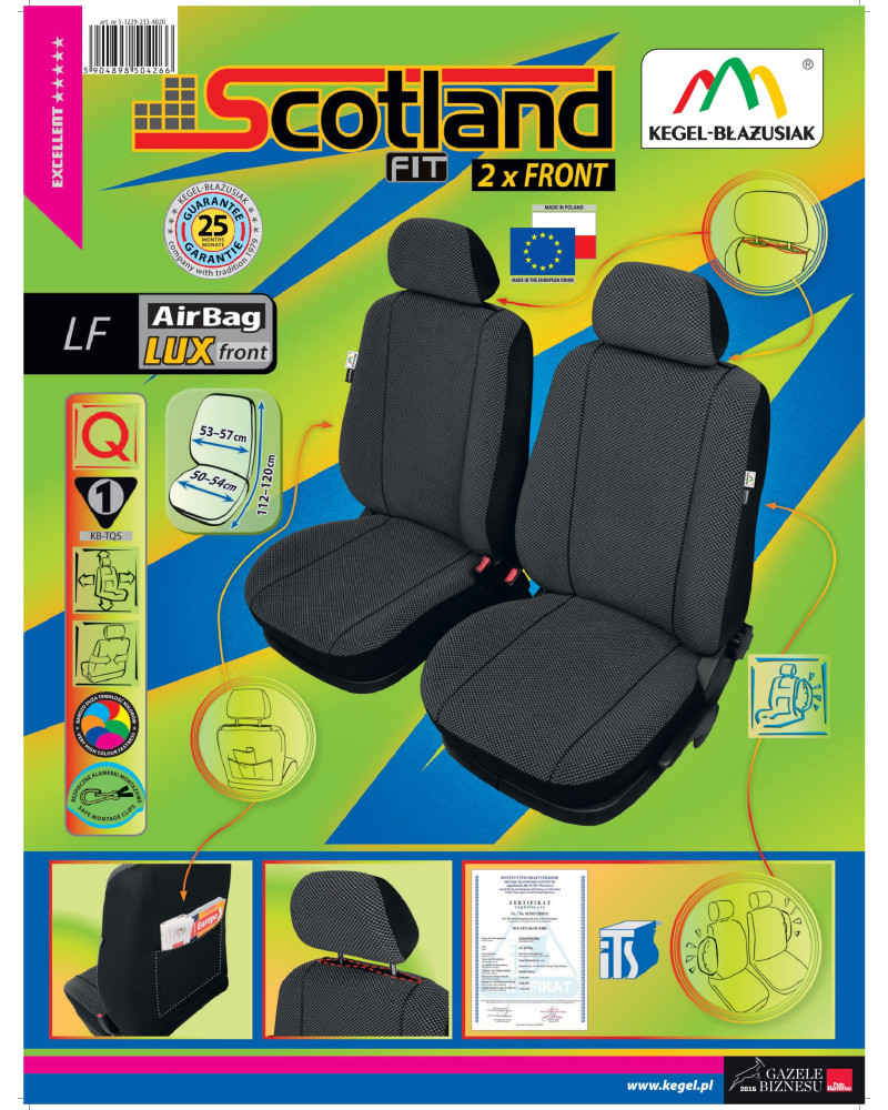 SCOTLAND well-fitted covers provide both safety and comfort for users. Made of the highest quality strong and flame-retardant material, they create an extraordinary aesthetic impression while protecting your car's upholstery from damage and dirt. Sewn for specific car models, taking into account all structural elements, they ensure a very good fit. The upholstery material from which the covers are made meets the highest strength standards - it is strong and durable. Maintained in dark, subdued colours, they look great in the interior of any vehicle. The tasteful white pattern on black fabric adds style and elegance. The innovative design and regularity ensure that the covers fit well on the seats of specific car models, and thanks to PUR foam lamination, they are highly adhesive. Enhance the interior of your car with a top-quality product.