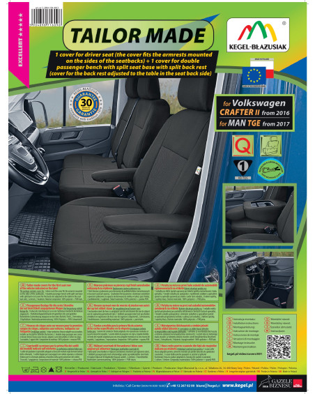 The covers have special, secure seams for airbags, making them suitable for cars with both side airbags in the seats and standard seats. Professional workmanship and safety of use are guaranteed by certification and testing by the Motor Transport Institute.