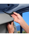 nfold the curtain inside the vehicle cabin. At the top edge of the curtain there are two pockets which should be placed over the sun flaps above the windscreen and fastened to the flaps with sewn-in Velcro strips. At the side upper edges of the curtain there are flaps with Velcro strips, with which the curtain is fastened to the car holders above the front door. Hooks sewn onto the ends of the upper edge of the curtain should be hooked onto the upper edges of the plastic pillar covers of the car. Finally place the bottom edge of the curtain with the sewn-in weight onto the cockpit of the vehicle as close as possible to the lower edge of the windscreen. This product is for use in a parked vehicle only, not to be used while driving.
