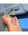 Inner windscreen and front door side windows curtain, covering the interior of the camper or delivery van cabin. Very good for blocking out the interior of the cabin from the view of people outside the vehicle. Provides a sense of privacy even in a crowded campsite or a car park. Reduces heat build-up inside the vehicle. Easy to put on (and take off) without having to screw or glue the curtain on. The weight sewn into the bottom edge holds the curtain in place when entering and exiting the vehicle.