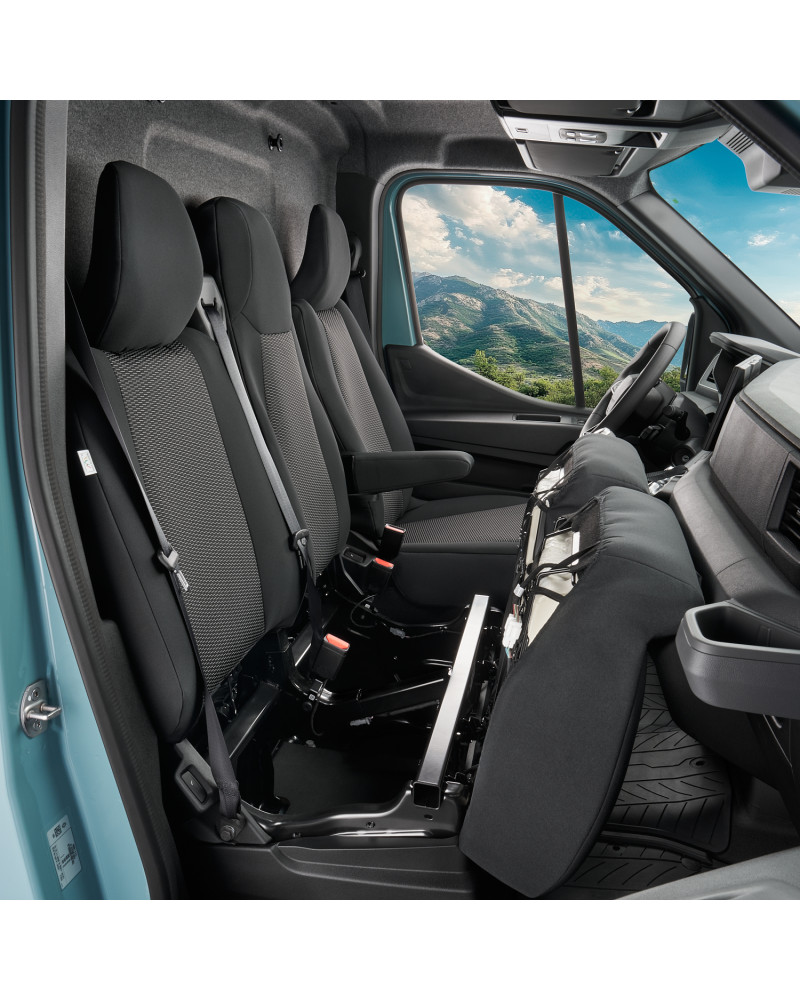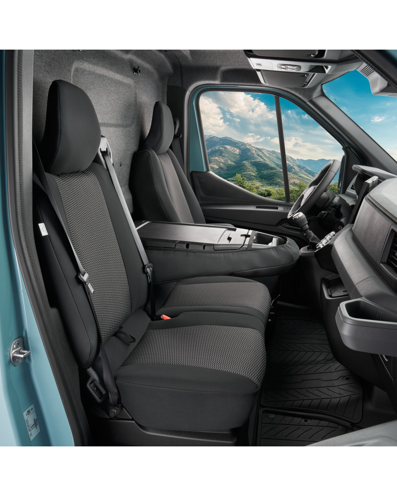 1 double passenger bench with split seat base wirh split back rest (cover for the back rest adjusted to the table in the seat back side)
