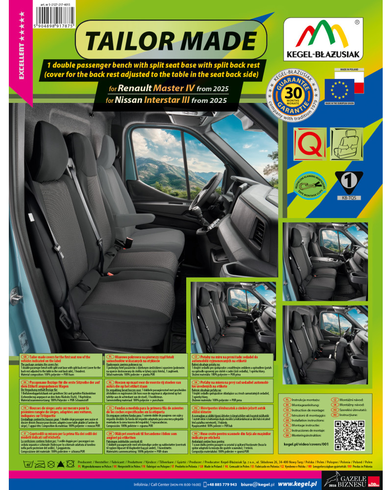 The covers have special, secure seams for airbags, making them suitable for cars with both side airbags in the seats and standard seats. Professional workmanship and safety of use are guaranteed by certification and testing by the Motor Transport Institute.