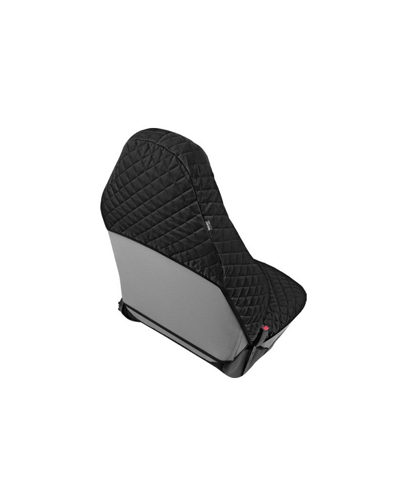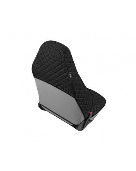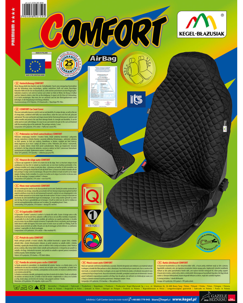 The COMFORT cover is a unique combination of natural cotton fabric and fluffy climate-regulating non-woven fabric, which makes the cover really thick, soft and springy. It allows the user to sink into it comfortably, making the journey much more pleasant. The material is characterised by high, almost 100% colour fastness and resistance to discolouration, abrasion and fading. It is strong, durable and resistant, yet very soft to the touch, like pure cotton. The cover provides effective insulation – it does not heat up in summer and insulates against the cold in winter. The COMFORT cover effectively protects the seat from damage and dirt. The cover fulfils its protective function very well as it covers the entire seat, including the sides and headrest. The headrest protection is integrated into the cover, so that once fitted, the seat looks great and resembles an aircraft seat. It ensures safety as it is adapted to seats with AirBag side cushions. It can be used on both the driver's and passenger's seats, as the safety seam, which tears during the deployment of the airbags, is sewn in on both the left and right sides. The cover is made in a universal size, so it fits most standard car seats. The product is very easy to install and clean.