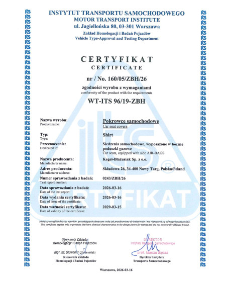 The safety of our covers is confirmed by a certificate and tests carried out by Instytut Transportu Samochodowego